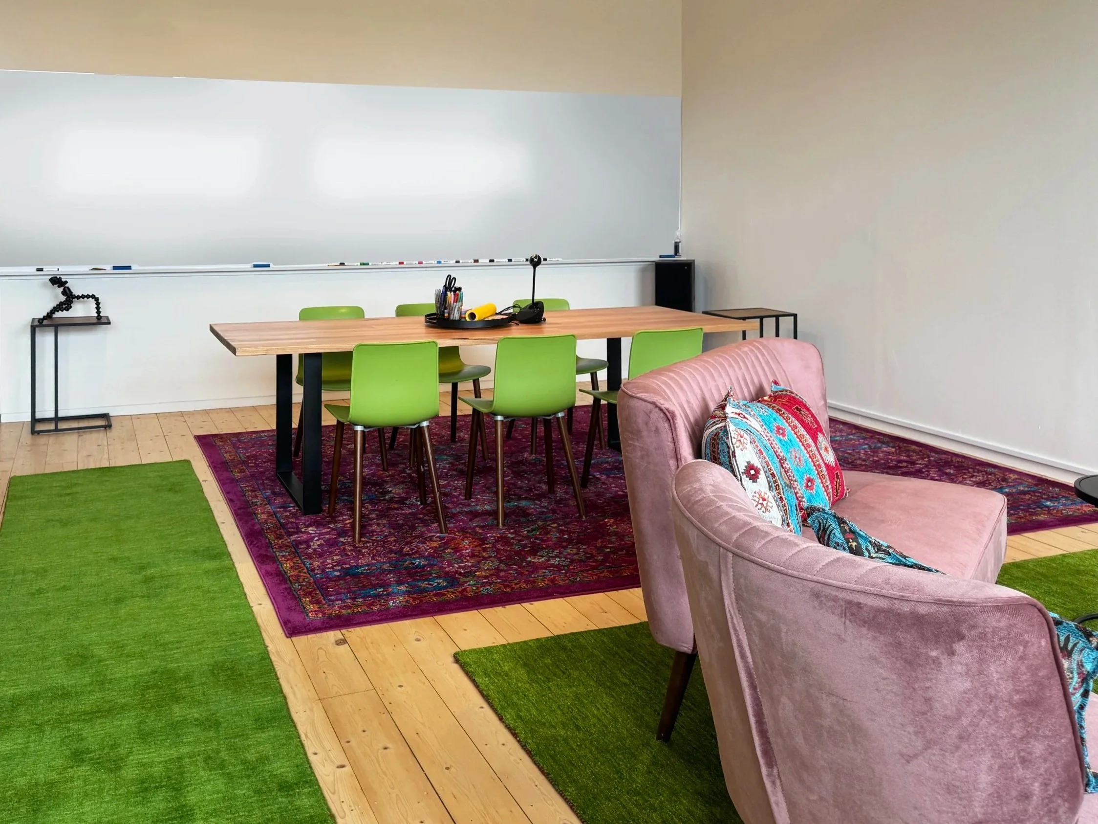 From solo deep-dives to 20-person power sessions, our light-drenched studio is built for flow.